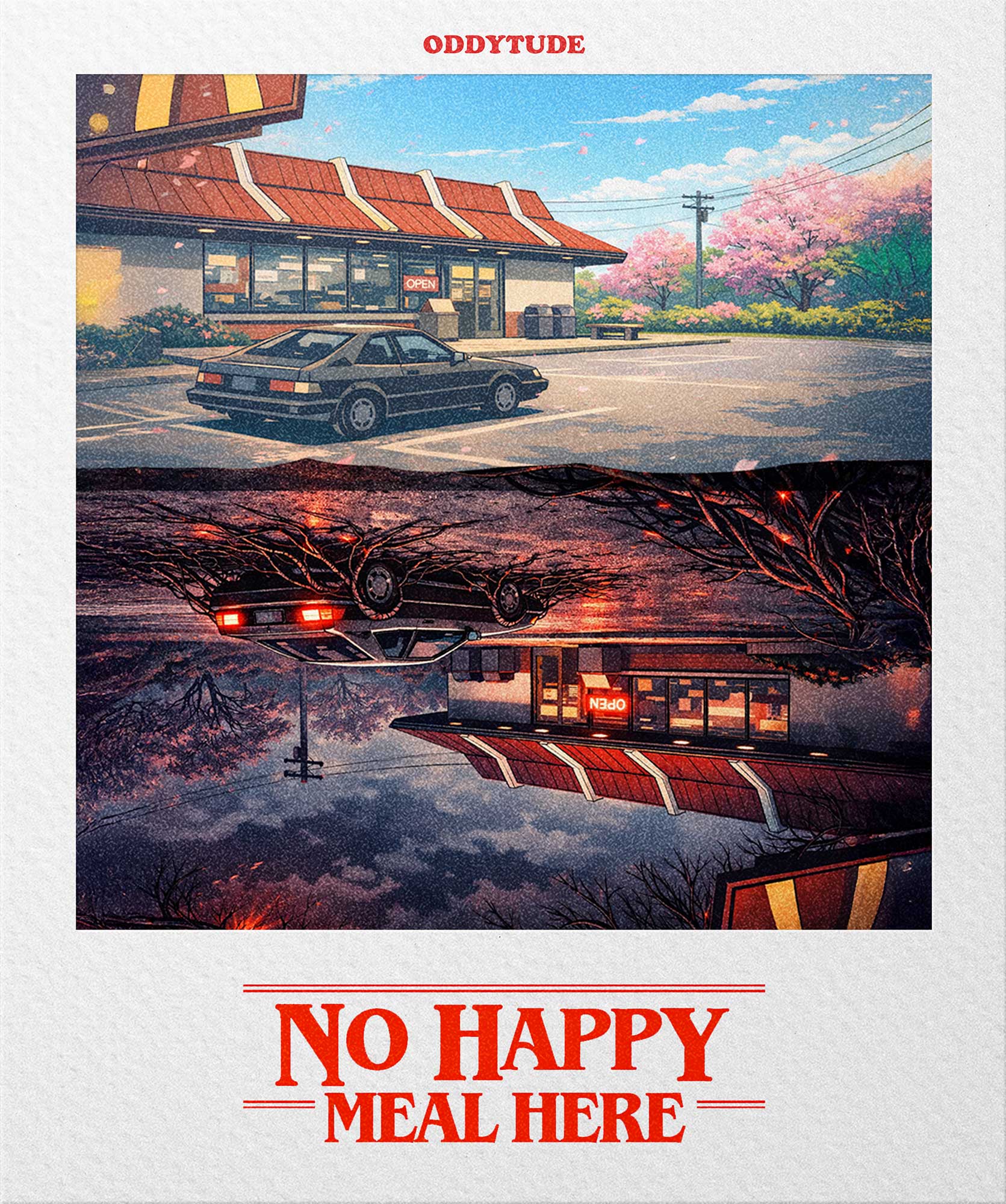 No Happy Meal Here – Unisex Oversized Shirt mit provokativem Statement. Hochwertiges Baumwoll-Shirt mit einzigartigem 80er-Jahre Polaroid Print und Upside-Down Design. Perfekt für alle, die Fast-Food-Kultur kritisch hinterfragen und ihre Haltung zeigen möchten. Oversized Passform für lässigen Streetwear-Look. Bewusst hergestellt mit Rücksicht auf die Umwelt.